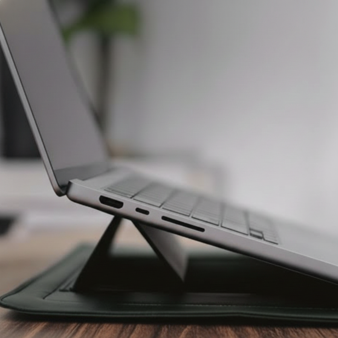 Su sistema plegable eleva tu laptop a la altura ideal, mejorando la postura y haciendo cada jornada más productiva.