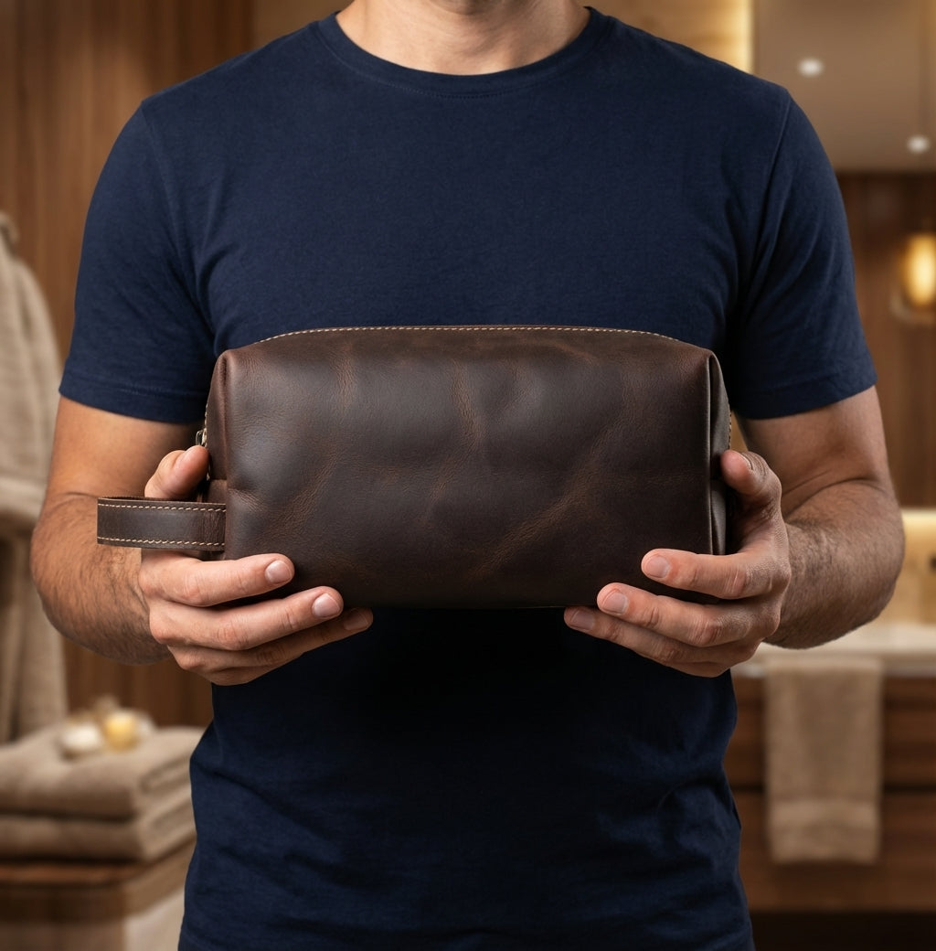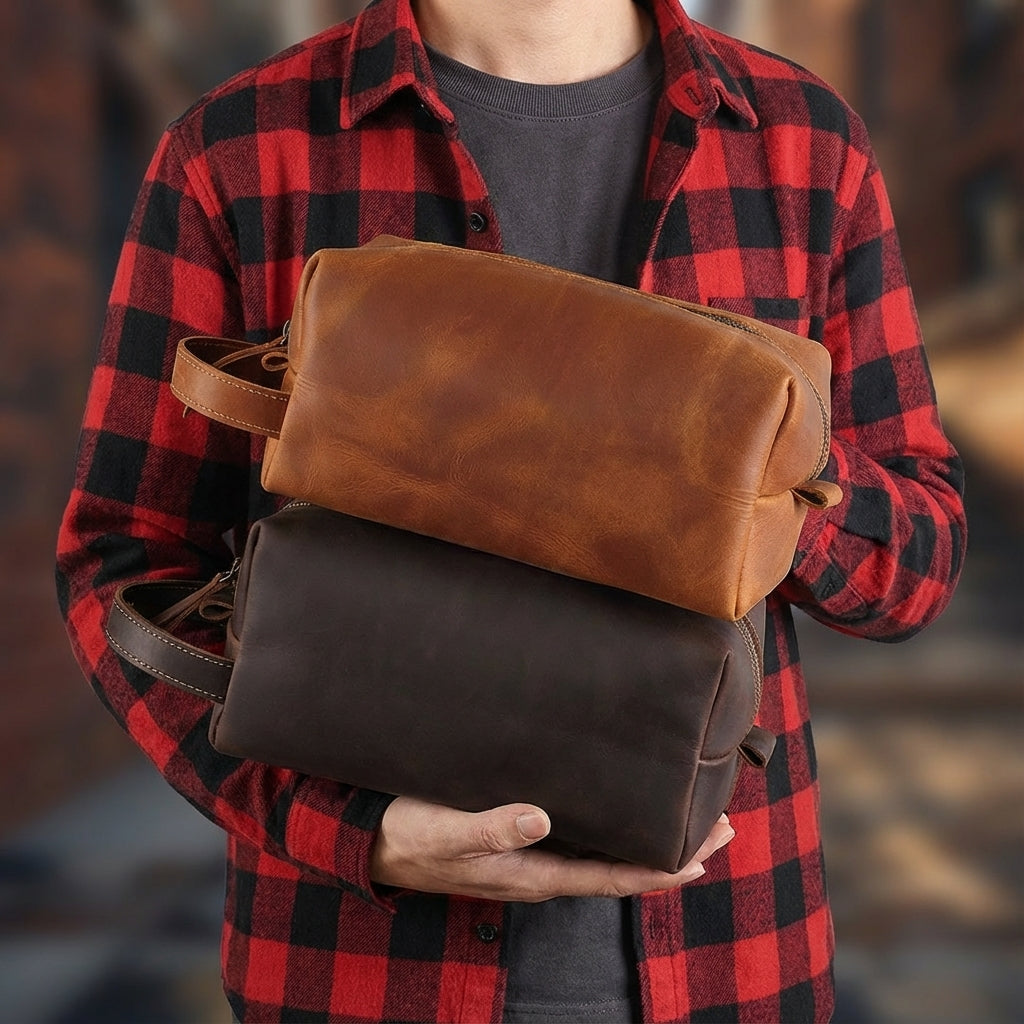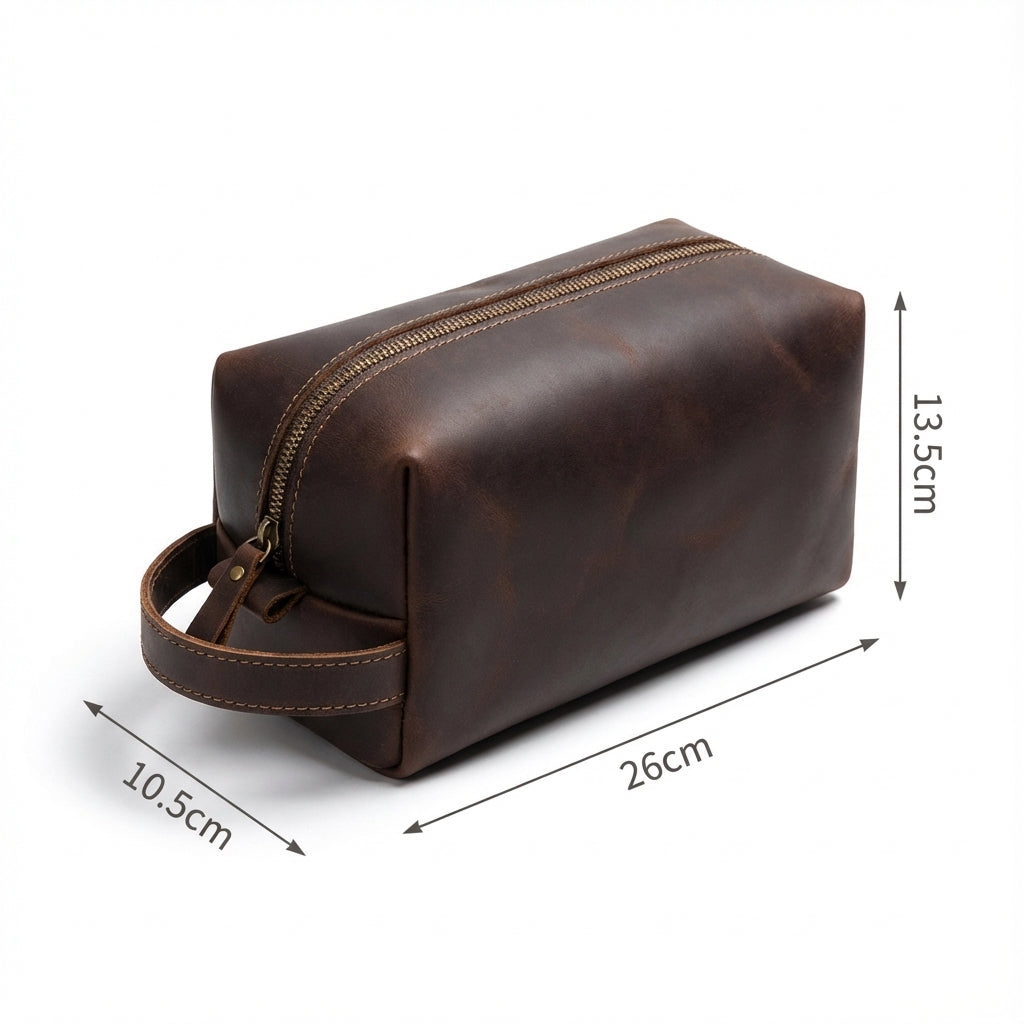 Fabricado en cuero Crazy Horse premium, este neceser combina estilo rústico, resistencia extrema y una capacidad ideal para llevar todo lo esencial. Su interior amplio permite acomodar fácilmente perfumes, lentes, cartera, cables, máquinas de afeitar y mucho más, sin perder su forma ni su estética elegante.