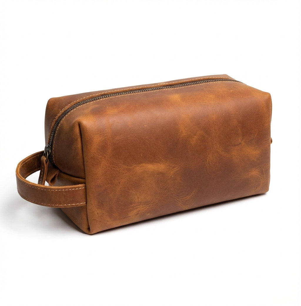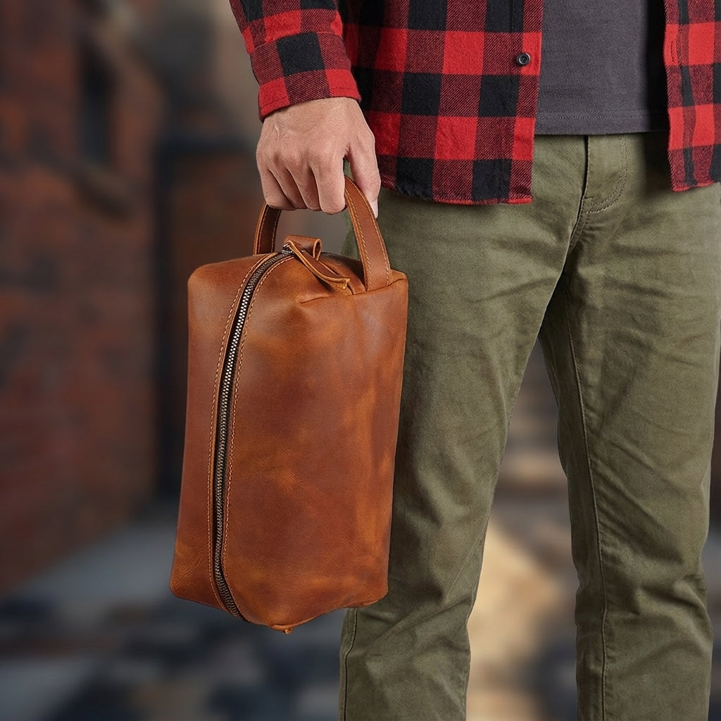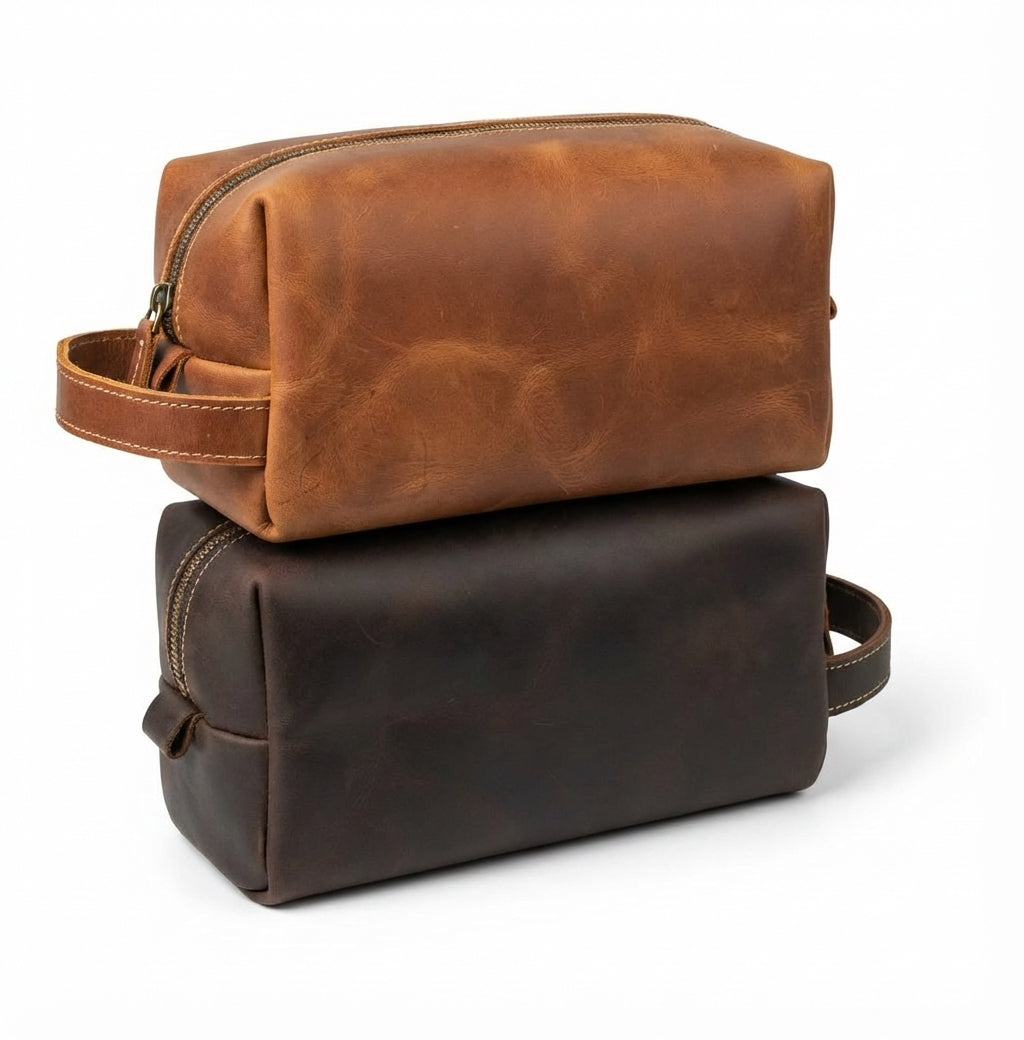 Fabricado en cuero Crazy Horse premium, este neceser combina estilo rústico, resistencia extrema y una capacidad ideal para llevar todo lo esencial. Su interior amplio permite acomodar fácilmente perfumes, lentes, cartera, cables, máquinas de afeitar y mucho más, sin perder su forma ni su estética elegante.