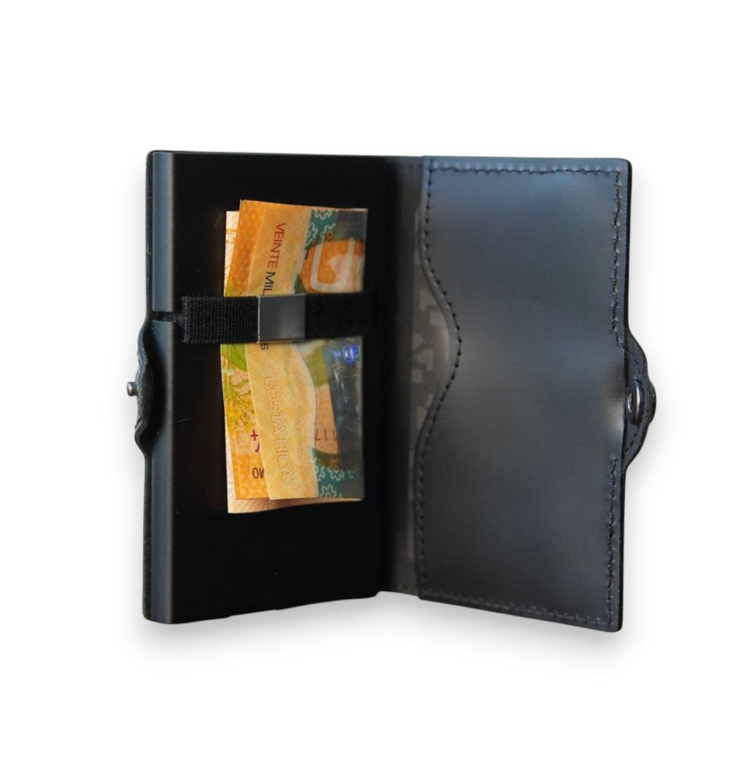 Cuenta con un tarjetero principal de aluminio ultra resistente, diseñado para mantener tus tarjetas protegidas y evitar que se doblen o se aprieten con el uso diario. Además, incorpora tecnología RFID para bloquear intentos de clonación y mantener tu información segura en todo momento.