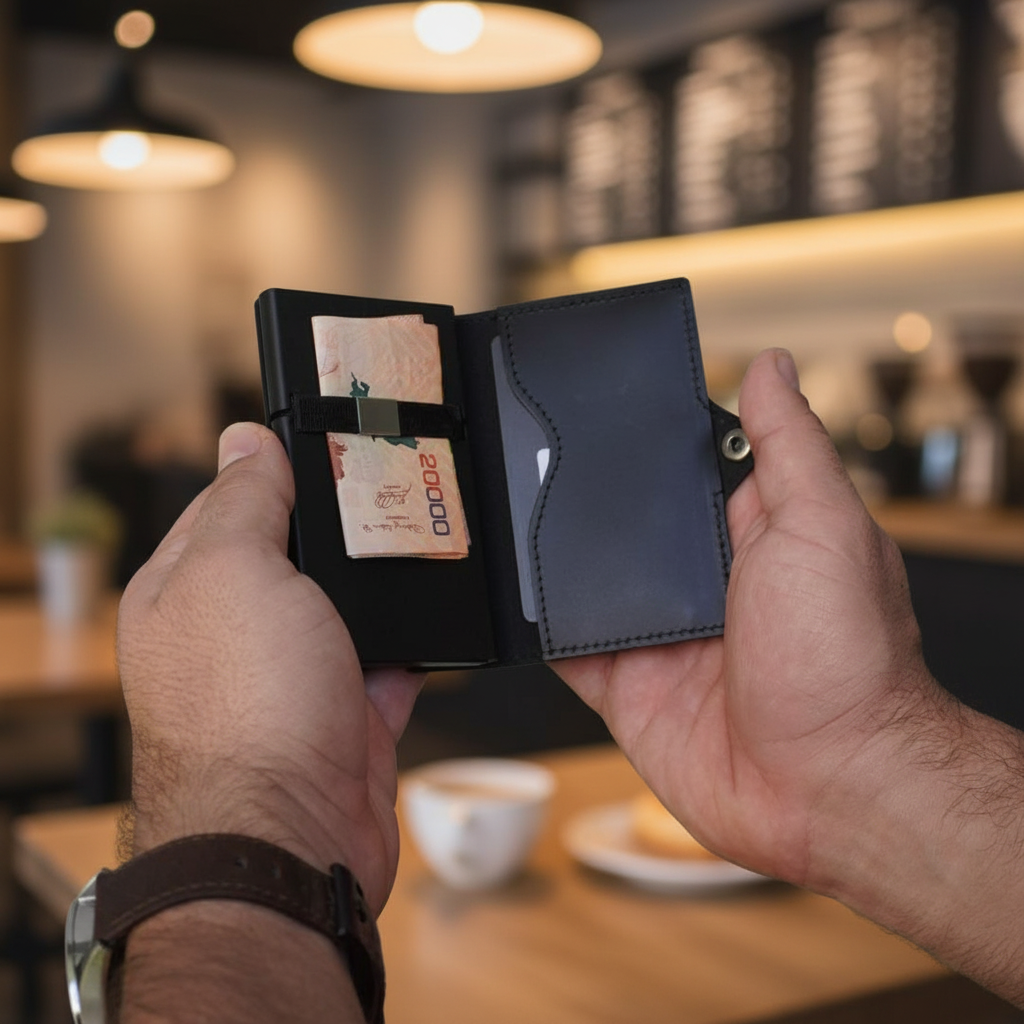 El Tarjetero Moscú combina un diseño compacto con un mecanismo práctico para acceder a tus tarjetas en segundos. Su carcasa de aluminio mantiene todo firme y protegido, ideal para el día a día.